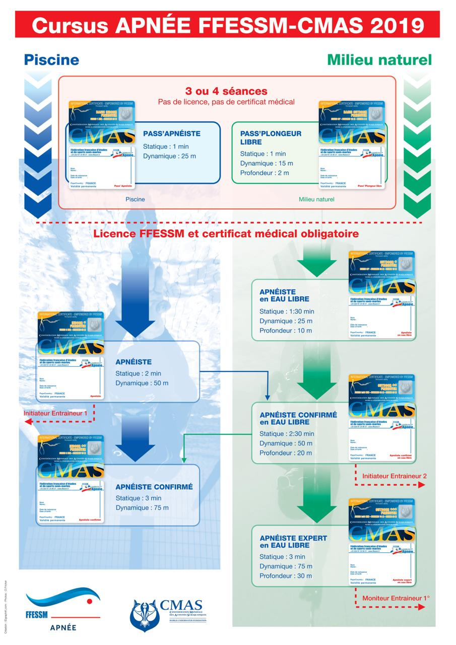 - Pass' Apnéiste (correspondance ancien niveau A1) : accessibilité sans licence, sans certificat médical en 3 ou 4 séances